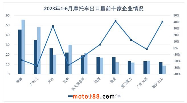 1-6月,摩托車出口量排名前十位的企業(yè)依次為:隆鑫、大長江、大冶、宗申、新大洲本田、銀翔、豪進、廈杏、大運、航天巴山,上述十家企業(yè)共出口222.18萬輛,占摩托車出口總量的57.4%。
