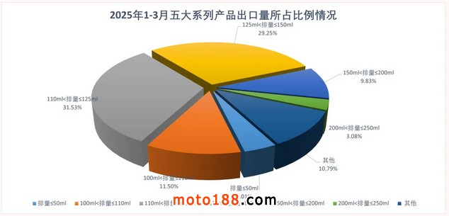 3月,出口量位居前六位的系列品種為:125系列(110ml<排量≤125ml)、150系列(125ml<排量≤150ml)、110系列(100ml<排量≤110ml)、200系列(150ml<排量≤200ml)、50系列(排量≤50ml)和250系列(200ml<排量≤250ml),分別出口35.06萬輛、32.58萬輛、12.58萬輛、10.31萬輛、4.72萬輛、3.14萬輛。與去年同期相比,125系列增長36.44%,150系列增長16.44%,110系列增長30.07%,200系列同比增長51.15%,50系列增長80.16%,250系列增長3.12%。
