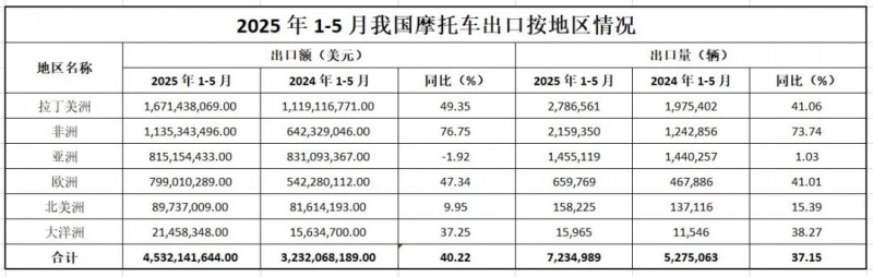 根據(jù)海關數(shù)據(jù)統(tǒng)計分析,2025年1-5月,我國摩托車整車出口量為723.50萬輛,較去年同期增長37.15%,出口額為45.32億美元,較去年同期增長40.22%。其中: