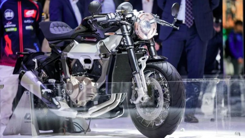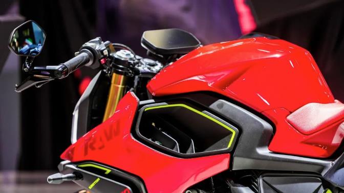 相較于動力表現(xiàn),EQVVS 600的造型設(shè)計(jì)更具競爭力。從側(cè)面觀察,車身前后端線條簡潔利落,設(shè)計(jì)重心刻意突出中間的四缸引擎;完全平放的V4引擎形成對稱的左右結(jié)構(gòu),裝飾性包圍殼也遵循對稱美學(xué),細(xì)節(jié)處理較為精細(xì),較好地傳遞出“自由與力量的野性”這一設(shè)計(jì)理念。