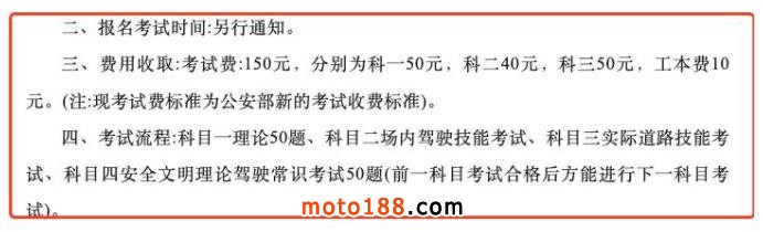 最近貴州滑石鄉(xiāng)就開(kāi)展了摩托車(chē)駕駛證送考活動(dòng),有需要考取摩托車(chē)駕駛證的群眾,直接在村委會(huì)預(yù)約登記,考試費(fèi)用直接按照公安部最新的考試標(biāo)準(zhǔn)進(jìn)行收取。科目一50元、科目二40元、科目三50元、工本費(fèi)10元,一共是150元。