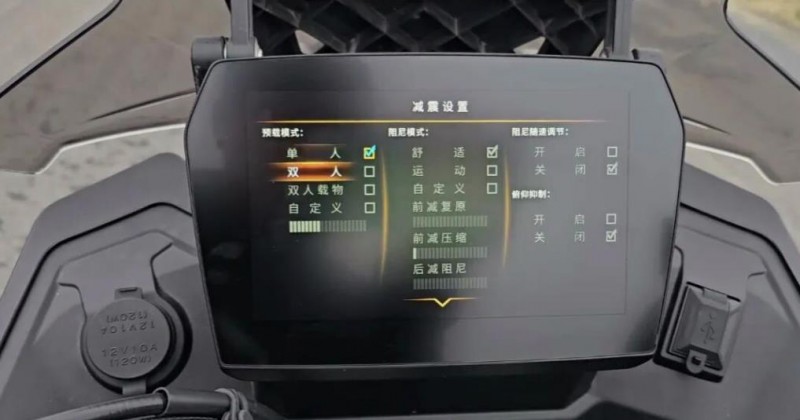 從目前一些博主拿到的車型來看,DS625X電減版主要的不同就是減震上的巨大升級。電子減震在進口品牌的高端車型上經(jīng)常會被搭載,在個人看來它最大的優(yōu)勢就是省去了手動調(diào)節(jié)的繁瑣步驟,完全由車輛ECU進行減震的動態(tài)調(diào)節(jié),既簡單效果又出色。從上圖儀表可以看到,DS625X電減版車型可以根據(jù)不同騎行模式下對預(yù)載、阻尼進行實時調(diào)節(jié),并且還支持俯仰抑制(急加速/急減速時加大阻尼抑制點頭/抬頭現(xiàn)象)和隨速調(diào)節(jié)功能(阻尼隨速度加大或減?。?/p>