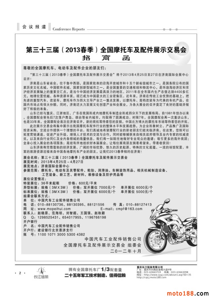 3、《中國摩托車配件生產(chǎn)企業(yè)大全(網(wǎng)址總匯)》第十一次升級版,在會上及各大市場同時(shí)發(fā)送。全國大市場還會送書上門,沒參會的企業(yè)可在門上坐等,愿意付郵費(fèi)(快遞到付也可)的企業(yè)我們都會快遞送達(dá)。