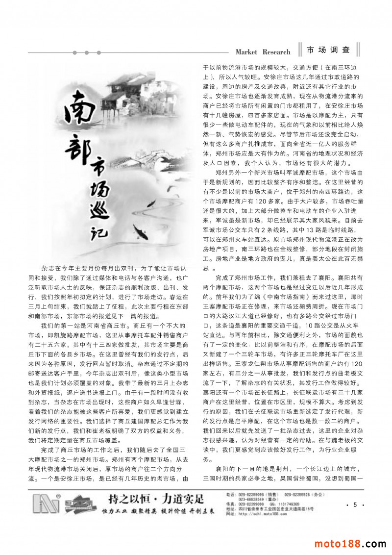 《摩托車與配件》自三月份正式改版后,雜志的    有較大的變化。因?yàn)槭莿倓偼瞥?,市?chǎng)還有一個(gè)適應(yīng)時(shí)期,尤其一些市場(chǎng)人士有顧慮,擔(dān)心頻率加快以后廣告的留存期縮短,還有擔(dān)心印刷量會(huì)下降。為了慎重起見(jiàn),我們雜志社在春運(yùn)一結(jié)束后就安排部分人員去華東和華南及中南、西南等市場(chǎng)走了一遍。先后去了如皋、無(wú)錫、撫順、臺(tái)州以及商丘、鄭州、武漢、襄陽(yáng)、荊州、株洲、長(zhǎng)株潭、廣州、重慶、成都等市場(chǎng),行程在隴海線南邊走了一圈。到市場(chǎng)第一線汲取客戶的意見(jiàn),了解市場(chǎng)的發(fā)行,調(diào)整了部分發(fā)行點(diǎn),并新建和恢復(fù)了六個(gè)發(fā)行點(diǎn),進(jìn)一步完善市場(chǎng)的發(fā)行。雜志改刊后不僅僅是期數(shù)的變化,更是一個(gè)系統(tǒng)的工作,這涉及到我們服務(wù)的提升,整個(gè)系統(tǒng)的升級(jí)。在這一期雜志內(nèi),我們會(huì)用一定的篇幅介紹我們所走過(guò)的市場(chǎng)的具體狀況。目前我們是行業(yè)長(zhǎng)期調(diào)整以來(lái)僅存的專業(yè)媒體,一方面我們面臨市場(chǎng)的風(fēng)險(xiǎn),如果不努力我們也會(huì)和前面已經(jīng)淪陷的媒體一樣,被市場(chǎng)拋棄。另一方面來(lái)自我們內(nèi)部及系統(tǒng)內(nèi)的風(fēng)險(xiǎn),即我們的管理和服務(wù)是否和雜志升級(jí)一樣,也在同步提升?我們面臨新的改革發(fā)展機(jī)會(huì),我們能否把握住、把握好?在進(jìn)行科學(xué)的發(fā)展時(shí),不能因?yàn)樘?nbsp;太快而摔跤,所以我們雜志在今年的發(fā)展目標(biāo)是:緊跟市場(chǎng)、穩(wěn)中求進(jìn)。在外銷市場(chǎng)面臨銷售不暢的現(xiàn)實(shí)情況下,如何服務(wù)好內(nèi)需內(nèi)銷市場(chǎng),這也是我們和生產(chǎn)型企業(yè)共同要探討的課題。通過(guò)對(duì)市場(chǎng)的走訪,我們有了目標(biāo)和方向,也有了信心和動(dòng)力。正因?yàn)榇?,我們?nèi)路萃瞥鲭p期后所產(chǎn)生的一系列問(wèn)題,我們都在妥善應(yīng)對(duì)。今年四月份濟(jì)南會(huì)議,我們會(huì)展現(xiàn)我們?nèi)ザ翊旱膭趧?dòng)成果: