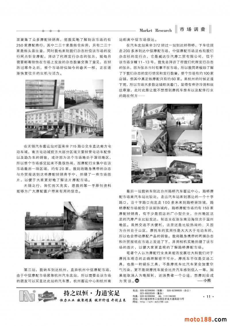 《摩托車與配件》自三月份正式改版后,雜志的 有較大的變化。因?yàn)槭莿倓偼瞥?,市?chǎng)還有一個(gè)適應(yīng)時(shí)期,尤其一些市場(chǎng)人士有顧慮,擔(dān)心頻率加快以后廣告的留存期縮短,還有擔(dān)心印刷量會(huì)下降。為了慎重起見(jiàn),我們雜志社在春運(yùn)一結(jié)束后就安排部分人員去華東和華南及中南、西南等市場(chǎng)走了一遍。先后去了如皋、無(wú)錫、撫順、臺(tái)州以及商丘、鄭州、武漢、襄陽(yáng)、荊州、株洲、長(zhǎng)株潭、廣州、重慶、成都等市場(chǎng),行程在隴海線南邊走了一圈。到市場(chǎng)第一線汲取客戶的意見(jiàn),了解市場(chǎng)的發(fā)行,調(diào)整了部分發(fā)行點(diǎn),并新建和恢復(fù)了六個(gè)發(fā)行點(diǎn),進(jìn)一步完善市場(chǎng)的發(fā)行。雜志改刊后不僅僅是期數(shù)的變化,更是一個(gè)系統(tǒng)的工作,這涉及到我們服務(wù)的提升,整個(gè)系統(tǒng)的升級(jí)。在這一期雜志內(nèi),我們會(huì)用一定的篇幅介紹我們所走過(guò)的市場(chǎng)的具體狀況。目前我們是行業(yè)長(zhǎng)期調(diào)整以來(lái)僅存的專業(yè)媒體,一方面我們面臨市場(chǎng)的風(fēng)險(xiǎn),如果不努力我們也會(huì)和前面已經(jīng)淪陷的媒體一樣,被市場(chǎng)拋棄。另一方面來(lái)自我們內(nèi)部及系統(tǒng)內(nèi)的風(fēng)險(xiǎn),即我們的管理和服務(wù)是否和雜志升級(jí)一樣,也在同步提升?我們面臨新的改革發(fā)展機(jī)會(huì),我們能否把握住、把握好?在進(jìn)行科學(xué)的發(fā)展時(shí),不能因?yàn)樘?nbsp;太快而摔跤,所以我們雜志在今年的發(fā)展目標(biāo)是:緊跟市場(chǎng)、穩(wěn)中求進(jìn)。在外銷市場(chǎng)面臨銷售不暢的現(xiàn)實(shí)情況下,如何服務(wù)好內(nèi)需內(nèi)銷市場(chǎng),這也是我們和生產(chǎn)型企業(yè)共同要探討的課題。通過(guò)對(duì)市場(chǎng)的走訪,我們有了目標(biāo)和方向,也有了信心和動(dòng)力。正因?yàn)榇?,我們?nèi)路萃瞥鲭p期后所產(chǎn)生的一系列問(wèn)題,我們都在妥善應(yīng)對(duì)。今年四月份濟(jì)南會(huì)議,我們會(huì)展現(xiàn)我們?nèi)ザ翊旱膭趧?dòng)成果: