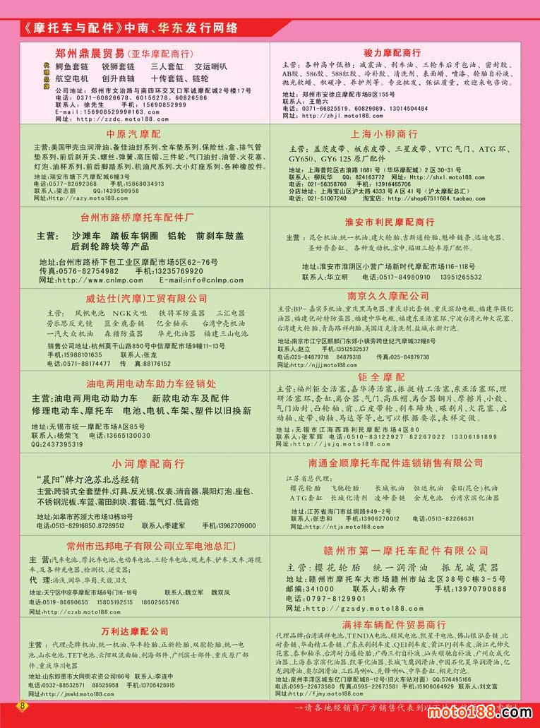 3、《中國摩托車配件生產(chǎn)企業(yè)大全(網(wǎng)址總匯)》第十一次升級版,在會上及各大市場同時發(fā)送。全國大市場還會送書上門,沒參會的企業(yè)可在門上坐等,愿意付郵費(快遞到付也可)的企業(yè)我們都會快遞送達。