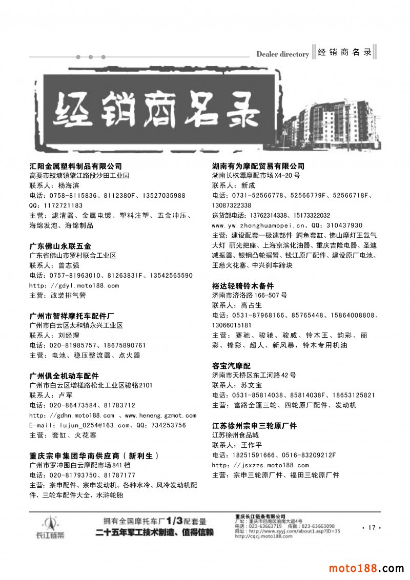 3、《中國摩托車配件生產企業(yè)大全(網址總匯)》第十一次升級版,在會上及各大市場同時發(fā)送。全國大市場還會送書上門,沒參會的企業(yè)可在門上坐等,愿意付郵費(快遞到付也可)的企業(yè)我們都會快遞送達。