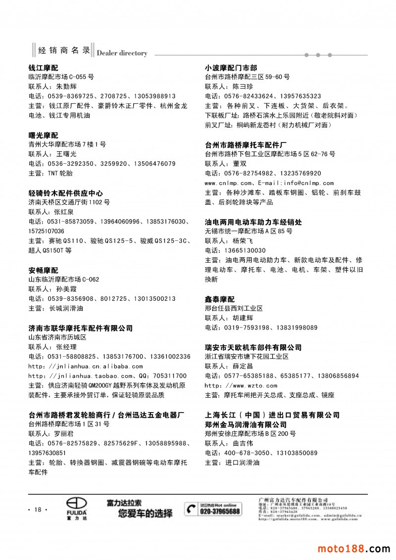 3、《中國摩托車配件生產(chǎn)企業(yè)大全(網(wǎng)址總匯)》第十一次升級版,在會上及各大市場同時發(fā)送。全國大市場還會送書上門,沒參會的企業(yè)可在門上坐等,愿意付郵費(快遞到付也可)的企業(yè)我們都會快遞送達。