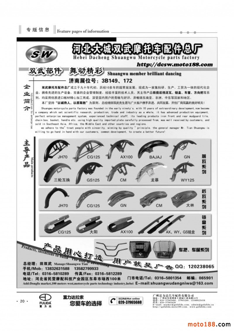 3、《中國摩托車配件生產(chǎn)企業(yè)大全(網(wǎng)址總匯)》第十一次升級版,在會上及各大市場同時發(fā)送。全國大市場還會送書上門,沒參會的企業(yè)可在門上坐等,愿意付郵費(fèi)(快遞到付也可)的企業(yè)我們都會快遞送達(dá)。