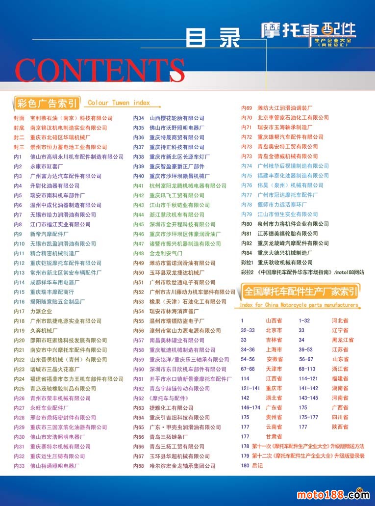 自我們的2010版《摩托車與配件生產(chǎn)企業(yè)大全》第十次升級版出刊后,已經(jīng)發(fā)行三年了?;仡櫸覀儚?010年至今的發(fā)行工作:2010年11月在南京全摩會上首發(fā),2011年4月長沙全摩會,2011年11月寧波全摩會,2012年4月重慶全摩會上大量發(fā)放。除了在這些大型會議上發(fā)放之外,我們也在江門、義烏、重慶、廣交會等地方性及國際性會議上及各地摩配市場發(fā)放,發(fā)行范圍涉及整車、配件及外貿(mào)企業(yè)。這本書受到行業(yè)各類企業(yè)歡迎,是因?yàn)樗切袠I(yè)最全面、最權(quán)威的采購參考資料。在2012年11月召開的廣州全摩會上,我們將進(jìn)行最后一次大規(guī)模的發(fā)放。至此,我們?nèi)甑陌l(fā)行承諾就將履行完畢。
