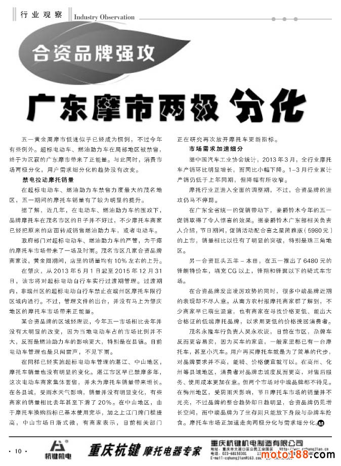 在4月29日全摩會結(jié)束之后,也有兩個與行業(yè)有關(guān)的會議,即5月6日的第23屆中國國際自行車展覽暨2013年中國國際摩托車及零部件交易會在上海新國際展覽中心召開。這次會議是以自行車及配件唱主角,電動車和摩托車作為配角而舉辦的大型會議,這次會議在自行車行業(yè)是規(guī)模最大的會議。與我們摩托車行業(yè)有關(guān)的一些從事外貿(mào)的整車廠,如建設(shè)、錢江等四五家廠家在附展館有一專門展廳。另外,輪胎企業(yè)有一個專門的展館,展品是外胎和內(nèi)胎。其中外胎來的大廠較多,也較全,比如正新、建大、朝陽,國內(nèi)有影響力的都基本來參會了,是這次會議的亮點。上海會議結(jié)束后,我們帶了部分外貿(mào)報紙和雜志在上海幾個市場進(jìn)行了發(fā)放,同時走訪了這些市場。自去年上半年,宜川市場拆遷后,在古浪路和滬太路分別形成了兩個市場。我們?nèi)チ嗣恳患疑虘?,收集市場客戶資料,為我們今年下半年《華東市場指南》的出版進(jìn)行準(zhǔn)備。這兩個市場都不算大,每一個市場有六七十戶做摩配生意的,有不少商家就是從宜川市場搬來的。還有兩個小市場,科雄和星中路市場,商戶比年初又有減少,市場明顯在萎縮。我們這次的《華東市場指南升級版》原準(zhǔn)備將江西不收錄其中,準(zhǔn)備和中南地區(qū)一起編入,但如果華東市場萎縮輻度較大,江西省還將編入華東地區(qū)。