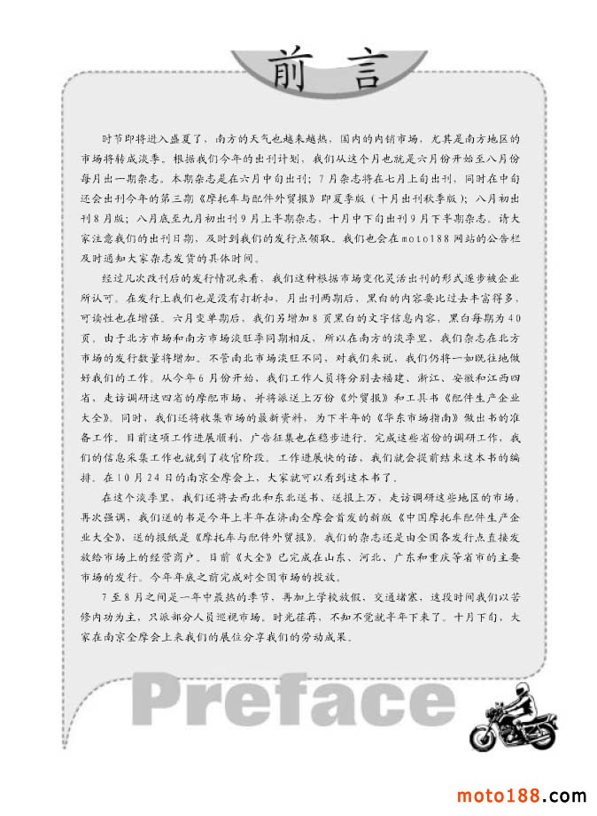 時(shí)節(jié)即將進(jìn)入盛夏了,南方的天氣也越來(lái)越熱,國(guó)內(nèi)的內(nèi)銷市場(chǎng),尤其是南方地區(qū)的市場(chǎng)將轉(zhuǎn)成淡季。根據(jù)我們今年的出刊計(jì)劃,我們從這個(gè)月也就是六月份開始至八月份每月出一期雜志。本期雜志是在六月中旬出刊;7月雜志將在七月上旬出刊,同時(shí)在中旬還會(huì)出刊今年的第三期《摩托車與配件外貿(mào)報(bào)》即夏季版(十月出刊秋季版);八月初出刊8月版;八月底至九月初出刊9月上半期雜志,十月中下旬出刊9月下半期雜志。請(qǐng)大家注意我們的出刊日期,及時(shí) 到我們的發(fā)行點(diǎn)領(lǐng)取。我們也會(huì)在moto188網(wǎng)站的公告欄及時(shí)通知大家雜志發(fā)貨的具體時(shí)間。