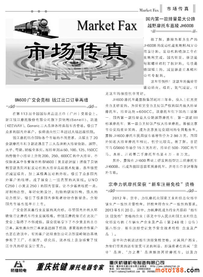 時(shí)節(jié)即將進(jìn)入盛夏了,南方的天氣也越來(lái)越熱,國(guó)內(nèi)的內(nèi)銷(xiāo)市場(chǎng),尤其是南方地區(qū)的市場(chǎng)將轉(zhuǎn)成淡季。根據(jù)我們今年的出刊計(jì)劃,我們從這個(gè)月也就是六月份開(kāi)始至八月份每月出一期雜志。本期雜志是在六月中旬出刊;7月雜志將在七月上旬出刊,同時(shí)在中旬還會(huì)出刊今年的第三期《摩托車(chē)與配件外貿(mào)報(bào)》即夏季版(十月出刊秋季版);八月初出刊8月版;八月底至九月初出刊9月上半期雜志,十月中下旬出刊9月下半期雜志。請(qǐng)大家注意我們的出刊日期,及時(shí) 到我們的發(fā)行點(diǎn)領(lǐng)取。我們也會(huì)在moto188網(wǎng)站的公告欄及時(shí)通知大家雜志發(fā)貨的具體時(shí)間。