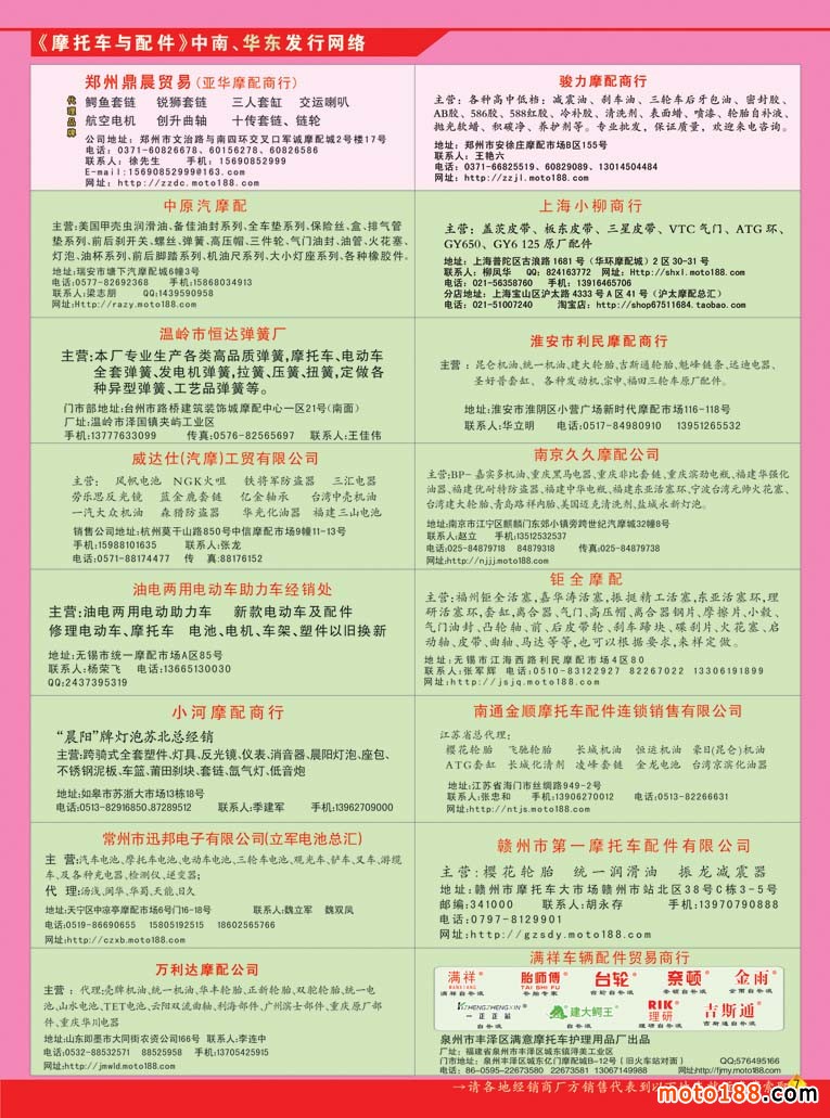 在這個(gè)淡季里,我們還將去西北和東北送書、送報(bào)上萬(wàn),走訪調(diào)研這些地區(qū)的市場(chǎng)。再次強(qiáng)調(diào),我們送的書是今年上半年在濟(jì)南全摩會(huì)首發(fā)的新版《中國(guó)摩托車配件生產(chǎn)企業(yè)大全》,送的報(bào)紙是《摩托車與配件外貿(mào)報(bào)》。我們的雜志還是由全國(guó)各發(fā)行點(diǎn)直接發(fā)放給市場(chǎng)上的經(jīng)營(yíng)商戶。目前《大全》已完成在山東、河北、廣東和重慶等省市的主要市場(chǎng)的發(fā)行。今年年底之前完成對(duì)全國(guó)市場(chǎng)的投放。