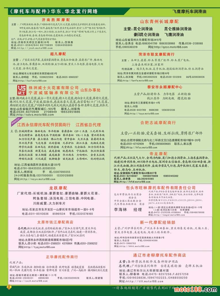 在這個淡季里,我們還將去西北和東北送書、送報上萬,走訪調(diào)研這些地區(qū)的市場。再次強(qiáng)調(diào),我們送的書是今年上半年在濟(jì)南全摩會首發(fā)的新版《中國摩托車配件生產(chǎn)企業(yè)大全》,送的報紙是《摩托車與配件外貿(mào)報》。我們的雜志還是由全國各發(fā)行點(diǎn)直接發(fā)放給市場上的經(jīng)營商戶。目前《大全》已完成在山東、河北、廣東和重慶等省市的主要市場的發(fā)行。今年年底之前完成對全國市場的投放。