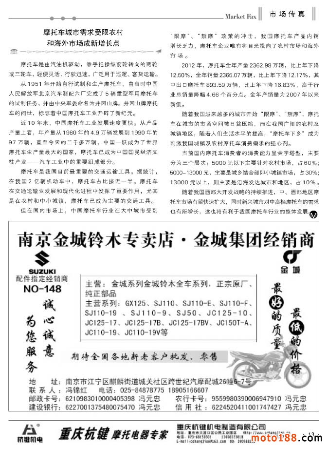 華東市場對我們來說總體感覺是:每況愈下,盡管這樣也有許多優(yōu)秀的企業(yè),優(yōu)秀的商戶,他們在還堅持,在千方百計的拓展市場,既是為了生存和發(fā)展也是為了一項事業(yè)。在物欲橫流、人心浮燥的外部環(huán)境下,行業(yè)有這樣的守望者,行業(yè)也會生生不息、綿延不絕。隨著東部市場淡季的結(jié)束,他們也會進入到收獲期。假如你有疑問,那么在十月金秋南京的秋摩會上,你會感受到這份努力的果實,這份執(zhí)著而帶來的回報。行業(yè)的總體盤子在不斷擴大,摩托車后市場的作為也越來越大,這是優(yōu)勝劣汰的進化過程,進化的結(jié)果是強者越強,在困難時候能堅守的必定是未來的成功者。當(dāng)然那些轉(zhuǎn)身離開者也未必都全是失敗者,會有新的商機靠他們?nèi)ゲ蹲?,只要勤勤懇懇、踏踏實實地努力,天道也會酬勤?br />        七月流火,盛夏轉(zhuǎn)秋,我們的雜志又到了出雙刊的月份了。今年的九、十、十一三個月我們每半月出一期雜志,經(jīng)過三、四、五月的嘗試,我們?nèi)〉昧艘恍┙逃?xùn),更積累了一定的經(jīng)驗,我們會做的比上半年更加成熟。經(jīng)過今夏的歷煉,我們的發(fā)行網(wǎng)絡(luò)也進一步的得到完善,愿接受大家的檢驗。目前宏觀經(jīng)濟形勢不是很好,但是對我們從事傳統(tǒng)行業(yè)實體經(jīng)營的企業(yè)來看,環(huán)境好像在慢慢地改變。新一屆國家領(lǐng)導(dǎo)人也意識到了,金融、房地產(chǎn)可以使少數(shù)人暴富,并不能使中國富強,農(nóng)業(yè)、工業(yè)才是立國之本。這對于我們制造業(yè)來說,改革將會給我們帶來更多紅利,行業(yè)加油!