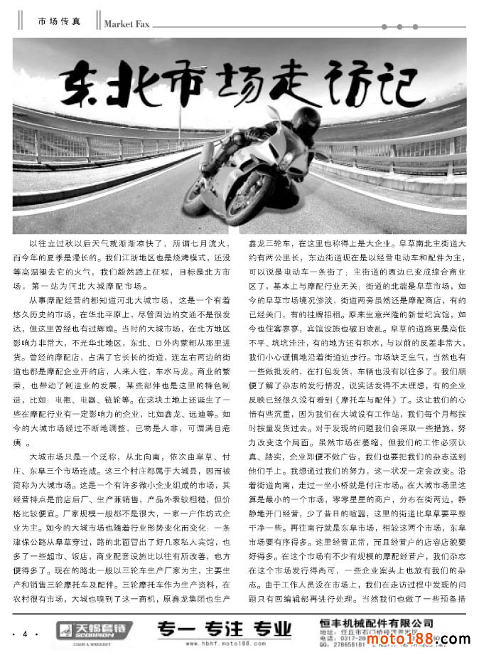 目前秋老虎終于收起了淫威,大部分地區(qū)氣候也慢慢地恢復(fù)到常態(tài),我們行業(yè)銷售的季節(jié)也開始了。我們雜志也從這個(gè)月開始出雙刊即半月一刊,由于是雙期,這一期的雜志相對(duì)較薄。完成全國(guó)摩配會(huì)議后,雜志還將根據(jù)行業(yè)具體情況作調(diào)整。受大環(huán)境的影響,尤其是國(guó)外市場(chǎng)的影響,今年的外貿(mào)形勢(shì)較去年相比形勢(shì)要差一些,在華南的外貿(mào)窗口也有所反映。從我們走訪的市場(chǎng)來看,盡管內(nèi)銷不旺,我們的北方市場(chǎng)(西北、華北和東北)在疲軟之中發(fā)展,至少?gòu)耐庥^上來說,不少市場(chǎng)面貌比以往有新的變化,這是市場(chǎng)的亮點(diǎn)。行業(yè)的冬季是這樣,那行業(yè)的春天會(huì)怎么樣呢?今年的秋季全國(guó)摩配展示交易會(huì)將在十月下旬南京召開,從會(huì)展的招展形勢(shì)來看,行業(yè)依然踴躍參與,包括明年春天在西安的全國(guó)摩配會(huì)議。從這么多企業(yè)的參與來看,行業(yè)同仁依然有一種精神在支持他們,不管市場(chǎng)的風(fēng)風(fēng)雨雨,我自巋然不動(dòng)。