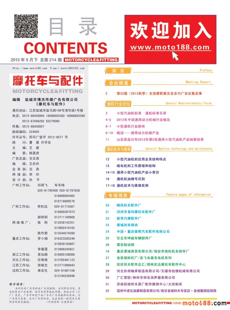 本期《摩托車與配件》雜志為小型汽油機專輯,這似乎與摩托車配件不太相關(guān),但我們還是用心地去組織了與通機行業(yè)有關(guān)的技術(shù)、標(biāo)準(zhǔn)及資訊類的文章。我們編纂這個專輯也是有以下各方面的原因: