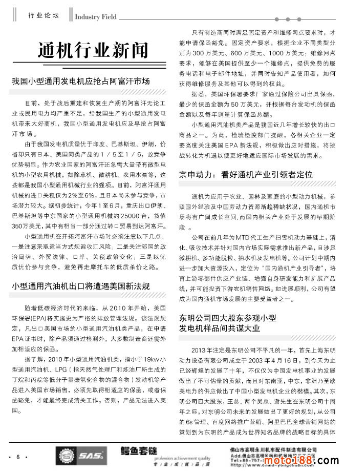 摩托車(chē)與配件》雜志為小型汽油機(jī)專輯,這似乎與摩托車(chē)配件不太相關(guān),但我們還是用心地去組織了與通機(jī)行業(yè)有關(guān)的技術(shù)、標(biāo)準(zhǔn)及資訊類的文章。我們編纂這個(gè)專輯也是有以下各方面的原因: