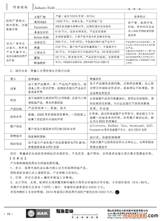 小型汽油機(jī)廣泛配套于發(fā)電機(jī)組、農(nóng)業(yè)機(jī)械、園林機(jī)械、小型工程機(jī)械,除專(zhuān)用、航空用以外的非道路用,往復(fù)活塞汽油發(fā)動(dòng)機(jī)、功率一般在20KW以?xún)?nèi),因?yàn)橥ㄓ眯詮?qiáng),適用于各種行業(yè),又被稱(chēng)為通機(jī)。我國(guó)的通用機(jī)械這十多來(lái)每年都保持較高速地增長(zhǎng),復(fù)合增長(zhǎng)率百分之三十二,產(chǎn)品大部分出口到歐美等發(fā)達(dá)國(guó)家,目前年產(chǎn)量已達(dá)到二千多萬(wàn)臺(tái),是世界第一生產(chǎn)大國(guó)。重慶地區(qū)裝備制造業(yè)發(fā)達(dá),摩托車(chē)產(chǎn)業(yè)為通用汽油機(jī)的產(chǎn)業(yè)配套和加工提供了集群優(yōu)勢(shì),宗申和隆鑫是我國(guó)最大的通機(jī)制造企業(yè)。由于通機(jī)和摩托車(chē)發(fā)動(dòng)機(jī)結(jié)構(gòu)相似,因而許多摩托車(chē)配件制造企業(yè)既生產(chǎn)摩托車(chē)配件也生產(chǎn)通機(jī)配件。盡管今年國(guó)際市場(chǎng)萎靡,但我國(guó)的通機(jī)制造和貿(mào)易出口仍有較大輻度增長(zhǎng),有許多制造企業(yè)都在加班加點(diǎn)生產(chǎn)通機(jī)配件。我國(guó)的通機(jī)出口和摩托車(chē)不一樣,主要出口歐美等發(fā)達(dá)國(guó)家,通機(jī)既有良好的外貿(mào)支撐,國(guó)內(nèi)市場(chǎng)也在不斷擴(kuò)大。隨著國(guó)內(nèi)農(nóng)業(yè)現(xiàn)代化步伐加快,十二五規(guī)劃,交通運(yùn)輸、水利水電仍是投資重點(diǎn),適合野外作業(yè)的便攜式發(fā)電機(jī)組需求量也在增大。隨著中國(guó)老年化的提前到來(lái),勞動(dòng)力的缺口,也為通機(jī)的推廣,開(kāi)拓了新的市場(chǎng)。日前我們?nèi)チ巳珖?guó)許多摩配市場(chǎng),已經(jīng)有一些嗅覺(jué)靈敏的企業(yè)在摩配市場(chǎng)銷(xiāo)售通機(jī)。通機(jī)和中國(guó)摩托車(chē)配件發(fā)動(dòng)機(jī)有天然的血緣關(guān)系,許多配件只是規(guī)格不同,生產(chǎn)工藝幾乎可以復(fù)制。這次我們?nèi)チ藮|北沈陽(yáng)市場(chǎng),我們市場(chǎng)工作人員,向我們反饋了通機(jī)的市場(chǎng)形勢(shì)及趨勢(shì)等相關(guān)信息,引起了我們對(duì)這個(gè)市場(chǎng)的關(guān)注。中國(guó)摩托車(chē)業(yè)是在外部形勢(shì)不斷地變化而修正、完善自己。我國(guó)摩托車(chē)制造業(yè)民營(yíng)三巨頭都是通機(jī)行業(yè)的領(lǐng)導(dǎo)者,隆鑫集團(tuán)不聲不響已在通機(jī)領(lǐng)域做成了行業(yè)的老大,其質(zhì)量和效益出口量都是全國(guó)首屈一指。我們只是感覺(jué)我們的嗅覺(jué)遲鈍,到現(xiàn)在才出這一期專(zhuān)輯。