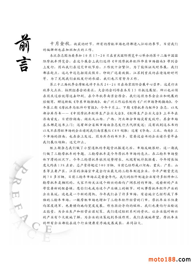 本次雜志因為要參加10月17-20日在重慶國際博覽中心舉辦的第十二屆中國國際摩托車博覽會,在這個展會上我們還將《中國摩托車配件華東市場指南》帶到會上發(fā)行,因而我們在過完中秋節(jié)后,工作就十分繁忙。為了能保證及時參展,我們都在趕點,這之中還包括國慶假日,印刷廠還要放假,江蘇到重慶的在途運輸時間等。為了兌現(xiàn)我們出版發(fā)行的承諾,我們也只有努力工作。