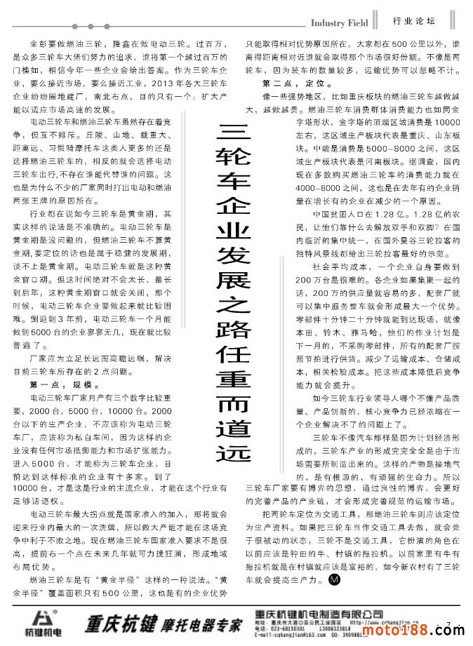 繼上期雜志我們做了小型通機的專題資訊報道之后,市場反映很好,這一期我們做了三輪摩托車的專題。三輪摩托車是今年摩托車市場的亮點,在二輪車市場整體下滑的狀況下,今年三輪摩托車依然逆勢增長。從現(xiàn)有統(tǒng)計數(shù)據(jù)看,今年增長幅度大約在13%左右,總產(chǎn)量將超過500萬輛。目前已經(jīng)形成以河南、重慶、廣東、山東等主要產(chǎn)區(qū),江蘇的淮海宗申是全行業(yè)最大的三輪車制造企業(yè),今年產(chǎn)銷量竟達到70多萬輛。目前三輪車市場正是黃金年代,我們的配件制造企業(yè)有許多配件和三輪摩托車是相同的,大家不妨關注這個新興的面向廣闊農(nóng)村的市場。這些新的產(chǎn)業(yè)帶需要新的配套鏈,愿你們也成為這個產(chǎn)業(yè)鏈上的鏈節(jié),對從事摩托車配件產(chǎn)業(yè)的企業(yè)來說,這也是一個新的商機。今年我們?nèi)チ嗽S多市場,有些地方已經(jīng)形成了單獨的三輪車市場,一般摩配市場也增加了三輪車配件經(jīng)營的門市,摩托車業(yè)不僅要向深度進軍,也要橫向地向?qū)挾劝l(fā)展。作為輿論導向的媒體,我們也要向行業(yè)輸送正能量,為企業(yè)生產(chǎn)和經(jīng)營出謀劃策。我們通過組織系列的資訊,讓企業(yè)能對新興的產(chǎn)業(yè)有個大致地了解,為企業(yè)的決策起到參謀作用。我們真誠地希望,摩托車業(yè)的所有企業(yè)都能在這個行業(yè)健康有序地發(fā)展成長,共同壯大。
