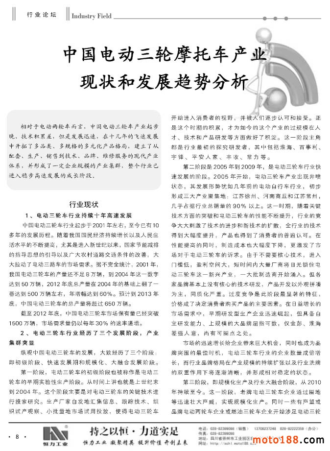 繼上期雜志我們做了小型通機(jī)的專題資訊報(bào)道之后,市場(chǎng)反映很好,這一期我們做了三輪摩托車的專題。三輪摩托車是今年摩托車市場(chǎng)的亮點(diǎn),在二輪車市場(chǎng)整體下滑的狀況下,今年三輪摩托車依然逆勢(shì)增長。從現(xiàn)有統(tǒng)計(jì)數(shù)據(jù)看,今年增長幅度大約在13%左右,總產(chǎn)量將超過500萬輛。目前已經(jīng)形成以河南、重慶、廣東、山東等主要產(chǎn)區(qū),江蘇的淮海宗申是全行業(yè)最大的三輪車制造企業(yè),今年產(chǎn)銷量竟達(dá)到70多萬輛。目前三輪車市場(chǎng)正是黃金年代,我們的配件制造企業(yè)有許多配件和三輪摩托車是相同的,大家不妨關(guān)注這個(gè)新興的面向廣闊農(nóng)村的市場(chǎng)。這些新的產(chǎn)業(yè)帶需要新的配套鏈,愿你們也成為這個(gè)產(chǎn)業(yè)鏈上的鏈節(jié),對(duì)從事摩托車配件產(chǎn)業(yè)的企業(yè)來說,這也是一個(gè)新的商機(jī)。今年我們?nèi)チ嗽S多市場(chǎng),有些地方已經(jīng)形成了單獨(dú)的三輪車市場(chǎng),一般摩配市場(chǎng)也增加了三輪車配件經(jīng)營的門市,摩托車業(yè)不僅要向深度進(jìn)軍,也要橫向地向?qū)挾劝l(fā)展。作為輿論導(dǎo)向的媒體,我們也要向行業(yè)輸送正能量,為企業(yè)生產(chǎn)和經(jīng)營出謀劃策。我們通過組織系列的資訊,讓企業(yè)能對(duì)新興的產(chǎn)業(yè)有個(gè)大致地了解,為企業(yè)的決策起到參謀作用。我們真誠地希望,摩托車業(yè)的所有企業(yè)都能在這個(gè)行業(yè)健康有序地發(fā)展成長,共同壯大。