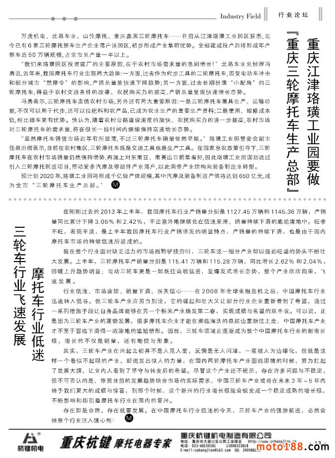 繼上期雜志我們做了小型通機的專題資訊報道之后,市場反映很好,這一期我們做了三輪摩托車的專題。三輪摩托車是今年摩托車市場的亮點,在二輪車市場整體下滑的狀況下,今年三輪摩托車依然逆勢增長。從現(xiàn)有統(tǒng)計數(shù)據(jù)看,今年增長幅度大約在13%左右,總產(chǎn)量將超過500萬輛。目前已經(jīng)形成以河南、重慶、廣東、山東等主要產(chǎn)區(qū),江蘇的淮海宗申是全行業(yè)最大的三輪車制造企業(yè),今年產(chǎn)銷量竟達到70多萬輛。目前三輪車市場正是黃金年代,我們的配件制造企業(yè)有許多配件和三輪摩托車是相同的,大家不妨關(guān)注這個新興的面向廣闊農(nóng)村的市場。這些新的產(chǎn)業(yè)帶需要新的配套鏈,愿你們也成為這個產(chǎn)業(yè)鏈上的鏈節(jié),對從事摩托車配件產(chǎn)業(yè)的企業(yè)來說,這也是一個新的商機。今年我們?nèi)チ嗽S多市場,有些地方已經(jīng)形成了單獨的三輪車市場,一般摩配市場也增加了三輪車配件經(jīng)營的門市,摩托車業(yè)不僅要向深度進軍,也要橫向地向?qū)挾劝l(fā)展。作為輿論導(dǎo)向的媒體,我們也要向行業(yè)輸送正能量,為企業(yè)生產(chǎn)和經(jīng)營出謀劃策。我們通過組織系列的資訊,讓企業(yè)能對新興的產(chǎn)業(yè)有個大致地了解,為企業(yè)的決策起到參謀作用。我們真誠地希望,摩托車業(yè)的所有企業(yè)都能在這個行業(yè)健康有序地發(fā)展成長,共同壯大。