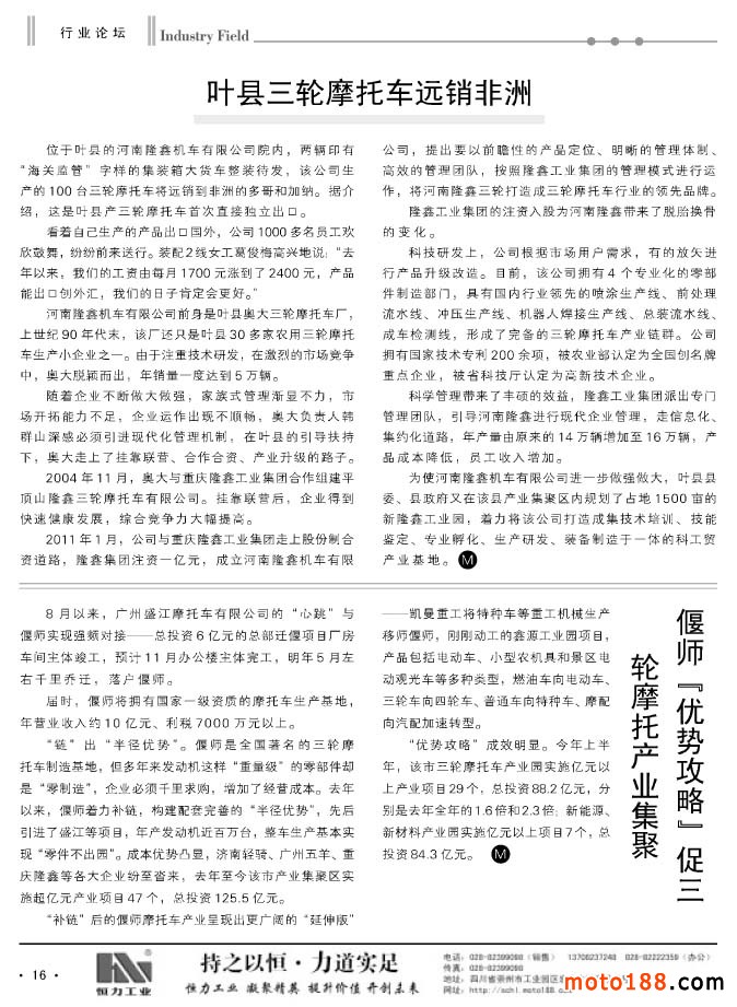 繼上期雜志我們做了小型通機(jī)的專題資訊報(bào)道之后,市場(chǎng)反映很好,這一期我們做了三輪摩托車的專題。三輪摩托車是今年摩托車市場(chǎng)的亮點(diǎn),在二輪車市場(chǎng)整體下滑的狀況下,今年三輪摩托車依然逆勢(shì)增長(zhǎng)。從現(xiàn)有統(tǒng)計(jì)數(shù)據(jù)看,今年增長(zhǎng)幅度大約在13%左右,總產(chǎn)量將超過(guò)500萬(wàn)輛。目前已經(jīng)形成以河南、重慶、廣東、山東等主要產(chǎn)區(qū),江蘇的淮海宗申是全行業(yè)最大的三輪車制造企業(yè),今年產(chǎn)銷量竟達(dá)到70多萬(wàn)輛。目前三輪車市場(chǎng)正是黃金年代,我們的配件制造企業(yè)有許多配件和三輪摩托車是相同的,大家不妨關(guān)注這個(gè)新興的面向廣闊農(nóng)村的市場(chǎng)。這些新的產(chǎn)業(yè)帶需要新的配套鏈,愿你們也成為這個(gè)產(chǎn)業(yè)鏈上的鏈節(jié),對(duì)從事摩托車配件產(chǎn)業(yè)的企業(yè)來(lái)說(shuō),這也是一個(gè)新的商機(jī)。今年我們?nèi)チ嗽S多市場(chǎng),有些地方已經(jīng)形成了單獨(dú)的三輪車市場(chǎng),一般摩配市場(chǎng)也增加了三輪車配件經(jīng)營(yíng)的門市,摩托車業(yè)不僅要向深度進(jìn)軍,也要橫向地向?qū)挾劝l(fā)展。作為輿論導(dǎo)向的媒體,我們也要向行業(yè)輸送正能量,為企業(yè)生產(chǎn)和經(jīng)營(yíng)出謀劃策。我們通過(guò)組織系列的資訊,讓企業(yè)能對(duì)新興的產(chǎn)業(yè)有個(gè)大致地了解,為企業(yè)的決策起到參謀作用。我們真誠(chéng)地希望,摩托車業(yè)的所有企業(yè)都能在這個(gè)行業(yè)健康有序地發(fā)展成長(zhǎng),共同壯大。