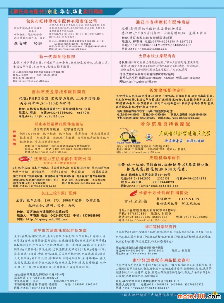 第三十三屆秋季全摩配也將于本月24-26日在南京國際會展中心召開,這是行業(yè)秋季大點兵。按照組委會的要求,大會的會刊將在本月15日抵達展館,所以也必須在國慶過后就得送去印刷。在今年秋季南京全摩會,我們還將為參會企業(yè)和觀展的經(jīng)銷商,贈送新版《華東市場指南》,由廣州工作站承制的《廣州市場導購指南》,今年第三期《摩托車與配件外貿(mào)報》,今年十月上、下期《摩托車與配件》雜志,以及部分庫存書——《中國摩托車配件生產(chǎn)企業(yè)大全》?!杜浼a(chǎn)企業(yè)大全》上半年在濟南首發(fā),目前除湖南、湖北及山西、廣西、河北部分市場沒有發(fā)放外,其余市場基本都是送書上門;還有部分省級市場由雜志發(fā)行點代理發(fā)送;沒有收到這本書的以及不在摩配市場的企業(yè)請到我們南京展位C89領(lǐng)??;還有《華南、三北、西南》三個市場的指南,也在會上發(fā)送。因為庫存的書不多,需要這些書的企業(yè)請盡量早去我們展位領(lǐng)取,送完即止。