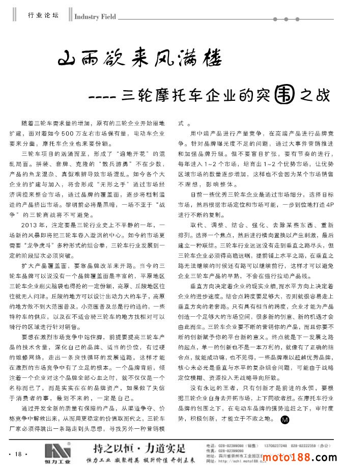 繼上期雜志我們做了小型通機(jī)的專題資訊報(bào)道之后,市場反映很好,這一期我們做了三輪摩托車的專題。三輪摩托車是今年摩托車市場的亮點(diǎn),在二輪車市場整體下滑的狀況下,今年三輪摩托車依然逆勢增長。從現(xiàn)有統(tǒng)計(jì)數(shù)據(jù)看,今年增長幅度大約在13%左右,總產(chǎn)量將超過500萬輛。目前已經(jīng)形成以河南、重慶、廣東、山東等主要產(chǎn)區(qū),江蘇的淮海宗申是全行業(yè)最大的三輪車制造企業(yè),今年產(chǎn)銷量竟達(dá)到70多萬輛。目前三輪車市場正是黃金年代,我們的配件制造企業(yè)有許多配件和三輪摩托車是相同的,大家不妨關(guān)注這個(gè)新興的面向廣闊農(nóng)村的市場。這些新的產(chǎn)業(yè)帶需要新的配套鏈,愿你們也成為這個(gè)產(chǎn)業(yè)鏈上的鏈節(jié),對(duì)從事摩托車配件產(chǎn)業(yè)的企業(yè)來說,這也是一個(gè)新的商機(jī)。今年我們?nèi)チ嗽S多市場,有些地方已經(jīng)形成了單獨(dú)的三輪車市場,一般摩配市場也增加了三輪車配件經(jīng)營的門市,摩托車業(yè)不僅要向深度進(jìn)軍,也要橫向地向?qū)挾劝l(fā)展。作為輿論導(dǎo)向的媒體,我們也要向行業(yè)輸送正能量,為企業(yè)生產(chǎn)和經(jīng)營出謀劃策。我們通過組織系列的資訊,讓企業(yè)能對(duì)新興的產(chǎn)業(yè)有個(gè)大致地了解,為企業(yè)的決策起到參謀作用。我們真誠地希望,摩托車業(yè)的所有企業(yè)都能在這個(gè)行業(yè)健康有序地發(fā)展成長,共同壯大。