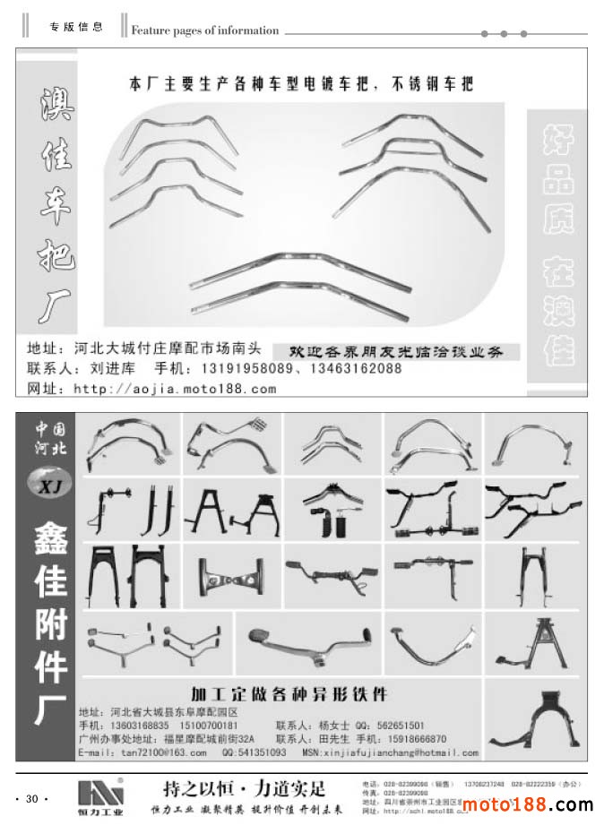 第三十三屆秋季全摩配也將于本月24-26日在南京國際會(huì)展中心召開,這是行業(yè)秋季大點(diǎn)兵。按照組委會(huì)的要求,大會(huì)的會(huì)刊將在本月15日抵達(dá)展館,所以也必須在國慶過后就得送去印刷。在今年秋季南京全摩會(huì),我們還將為參會(huì)企業(yè)和觀展的經(jīng)銷商,贈(zèng)送新版《華東市場指南》,由廣州工作站承制的《廣州市場導(dǎo)購指南》,今年第三期《摩托車與配件外貿(mào)報(bào)》,今年十月上、下期《摩托車與配件》雜志,以及部分庫存書——《中國摩托車配件生產(chǎn)企業(yè)大全》?!杜浼a(chǎn)企業(yè)大全》上半年在濟(jì)南首發(fā),目前除湖南、湖北及山西、廣西、河北部分市場沒有發(fā)放外,其余市場基本都是送書上門;還有部分省級市場由雜志發(fā)行點(diǎn)代理發(fā)送;沒有收到這本書的以及不在摩配市場的企業(yè)請到我們南京展位C89領(lǐng)??;還有《華南、三北、西南》三個(gè)市場的指南,也在會(huì)上發(fā)送。因?yàn)閹齑娴臅欢?,需要這些書的企業(yè)請盡量早去我們展位領(lǐng)取,送完即止。