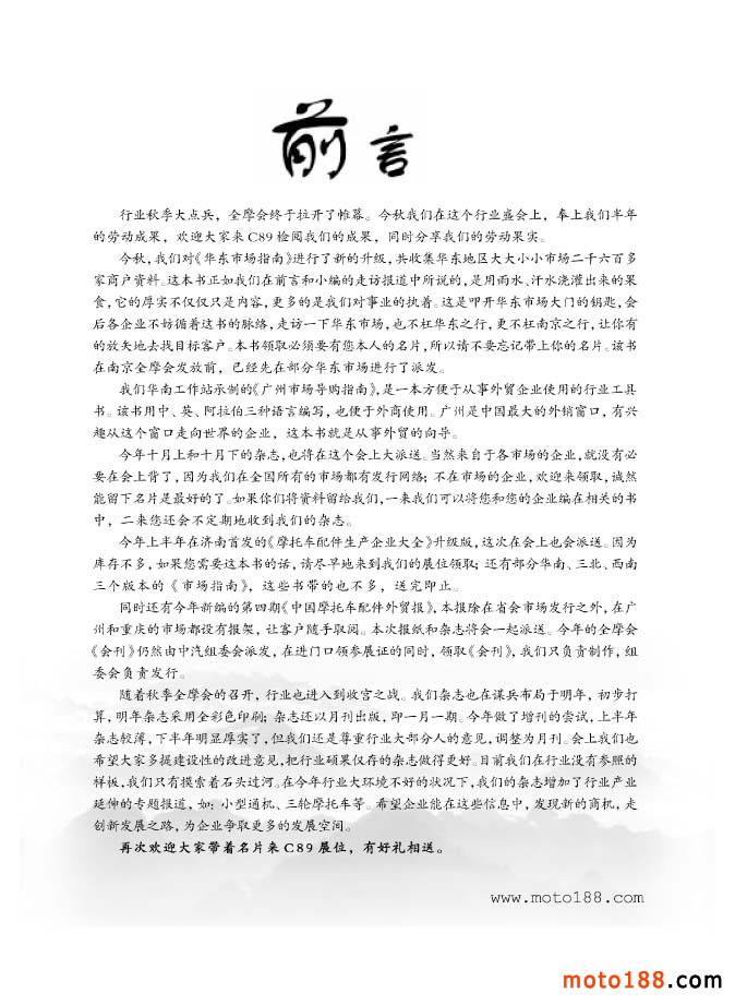 同時(shí)還有今年新編的第四期《中國(guó)摩托車(chē)配件外貿(mào)報(bào)》,本報(bào)除在省會(huì)市場(chǎng)發(fā)行之外,在廣州和重慶的市場(chǎng)都設(shè)有報(bào)架,讓客戶隨手取閱。本次報(bào)紙和雜志將會(huì)一起派送。今年的全摩會(huì)《會(huì)刊》仍然由中汽組委會(huì)派發(fā),在進(jìn)門(mén)口領(lǐng)參展證的同時(shí),領(lǐng)取《會(huì)刊》,我們只負(fù)責(zé)制作,組委會(huì)負(fù)責(zé)發(fā)行。