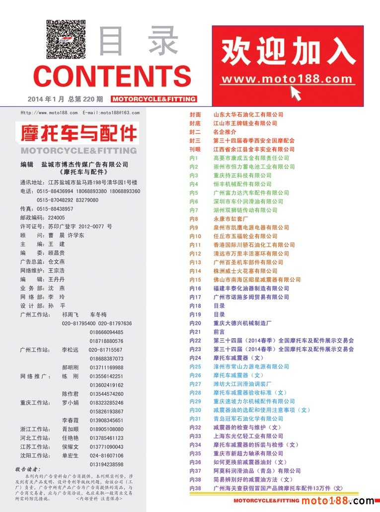 和這些歷經(jīng)風(fēng)雨在摩配行業(yè)堅守的同仁們一樣,我們也煉得自信與從容。新的一年我們雜志以全新的面貌出現(xiàn),我們采用全彩色出刊,同時將我們的服務(wù)對象橫向延伸。與我們的同仁一樣,立足摩配,橫向拓展,內(nèi)外兼修,努力做好雜志,除了提升外觀品相,更是注重在內(nèi)容上的變化。每期雜志用十頁左右的文字來廣角掃描我們摩托車配件行業(yè)的子行業(yè),這一期推出的是減震器專題。上一期化油器專題出刊以后,不光受到市場的歡迎,有些企業(yè)還把我們的雜志認真地收藏保存好,因為有不少信息對于他們的生產(chǎn)、經(jīng)營都有一定幫助。對我們來說也是迫使我們更深入地了解摩配的各個子行業(yè)。自從前年摩托車行業(yè)開始強制提高排放標準以后,我們片面地認為化油器這個行業(yè)會被電噴完全取代,這個產(chǎn)業(yè)是不是已經(jīng)步入到夕陽期?通過編排我們較深刻的對這一產(chǎn)業(yè)有所了解,制造之地一派欣欣向榮的景象,在我們摩托車業(yè)需求量減少之時,我們的制造廠已經(jīng)在通機領(lǐng)域干得風(fēng)生水起,有不少廠即使擴大產(chǎn)能也供不應(yīng)求。當?shù)氐胤秸矎倪@個產(chǎn)業(yè)得到許多實惠,一個雙贏的局面,這就是產(chǎn)業(yè)的正能量。其實市場如何變幻,總有一批做得好的龍頭企業(yè)在努力工作,打造自己的名牌,眼光不僅僅局限面前,更多地瞄準了國際市場。中國制造能漂洋過海,被國外消費者所接受,正是這樣一批行業(yè)精英為國家和民族在努力。