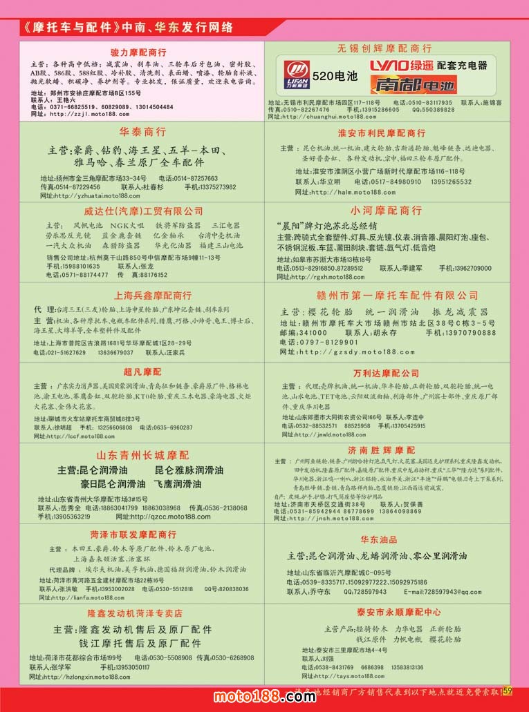 《摩托車與配件》經(jīng)過十多年發(fā)展和企業(yè)一起成熟,但并沒有變老,永遠(yuǎn)保持與時俱進(jìn)的青春活力,部分市場在變,我們的意志和恒心不變。我們根據(jù)這兩個大區(qū)的變化,也給雜志進(jìn)行了一次新的定位,配件行業(yè)是我們的主戰(zhàn)場,我們始終在配件行業(yè)耕耘。盡管電動車的配件沒有摩托車的多和廣,但我們已經(jīng)采取措施在許多市場里將電動車配件經(jīng)營企業(yè)也納入到我們的送書計劃里。在以后出的《指南》類書籍里,在也會將市場里從事電動車配件批發(fā)的選錄進(jìn)來。“問渠那得清如許?唯有源頭活水來”。這是一個恒久的市場,卻又是時時在變化的市場,尤如鐵打的營盤流水的兵,市場是鐵打,里面經(jīng)營的企業(yè)就是流水,只有流動的水才是活水。