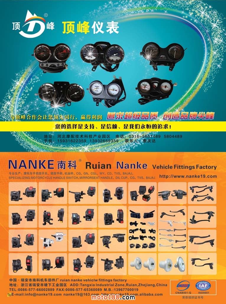 全摩會還有2個多月就在廣州召開了,這次會上我們將奉獻給大家的是第12次升級的《中國摩托車配件生產(chǎn)企業(yè)大全》在這本書中。我們新增了目錄銷售排名前10-20名的摩托車整車生產(chǎn)企業(yè),二輪電動車生產(chǎn)企業(yè)、燃油和電動三輪生產(chǎn)企業(yè)的名錄,方便大家在增加經(jīng)營的同時,有所選擇和參考?!度A南市場指南》含廣東和海南兩省市場經(jīng)銷商戶的資料,其中的廣州白云區(qū)羅沖圍一帶的市場是用中英文雙語編排,方便外商的閱讀;其余例行的十一期雜志和外貿(mào)報紙;另外還有部分華東和西北地區(qū)的新的市場指南(已經(jīng)在南京和西安會議首發(fā))。如果有興趣從事新能源汽車業(yè)務(wù)的企業(yè)也可拿到《新能源車》雜志。這是我們新出的雜志,具體可去moto189網(wǎng)站上瀏覽到全部的內(nèi)容,在此不多贅述。記住廣州再見,帶上你的名片到1075展位領(lǐng)書去!