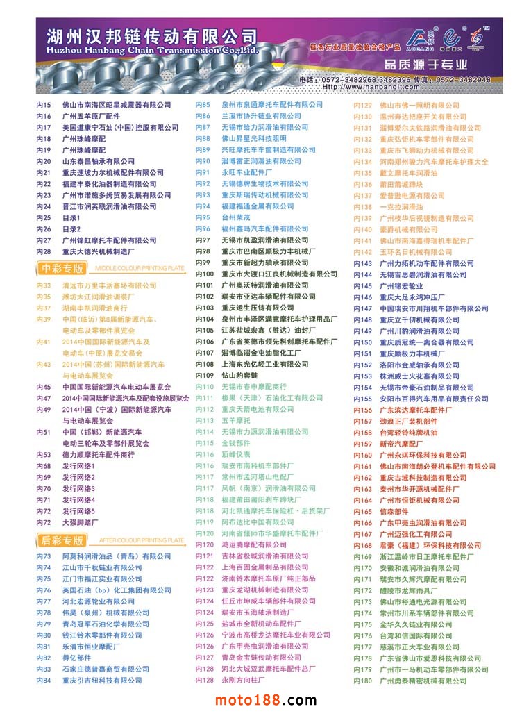 全摩會(huì)還有2個(gè)多月就在廣州召開了,這次會(huì)上我們將奉獻(xiàn)給大家的是第12次升級(jí)的《中國(guó)摩托車配件生產(chǎn)企業(yè)大全》在這本書中。我們新增了目錄銷售排名前10-20名的摩托車整車生產(chǎn)企業(yè),二輪電動(dòng)車生產(chǎn)企業(yè)、燃油和電動(dòng)三輪生產(chǎn)企業(yè)的名錄,方便大家在增加經(jīng)營(yíng)的同時(shí),有所選擇和參考?!度A南市場(chǎng)指南》含廣東和海南兩省市場(chǎng)經(jīng)銷商戶的資料,其中的廣州白云區(qū)羅沖圍一帶的市場(chǎng)是用中英文雙語(yǔ)編排,方便外商的閱讀;其余例行的十一期雜志和外貿(mào)報(bào)紙;另外還有部分華東和西北地區(qū)的新的市場(chǎng)指南(已經(jīng)在南京和西安會(huì)議首發(fā))。如果有興趣從事新能源汽車業(yè)務(wù)的企業(yè)也可拿到《新能源車》雜志。這是我們新出的雜志,具體可去moto189網(wǎng)站上瀏覽到全部的內(nèi)容,在此不多贅述。記住廣州再見,帶上你的名片到1075展位領(lǐng)書去!