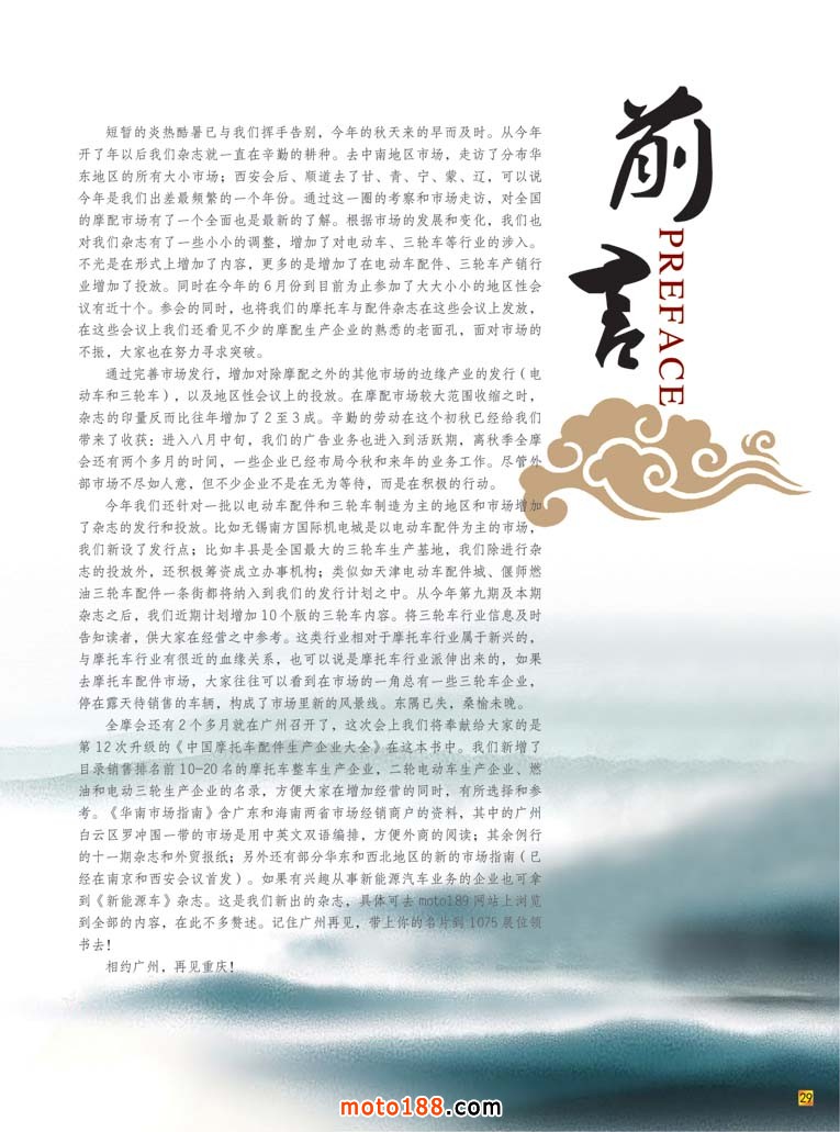 短暫的炎熱酷暑已與我們揮手告別,今年的秋天來的早而及時。從今年開了年以后我們雜志就一直在辛勤的耕種。去中南地區(qū)市場,走訪了分布華東地區(qū)的所有大小市場;西安會后、順道去了甘、青、寧、蒙、遼,可以說今年是我們出差最頻繁的一個年份。通過這一圈的考察和市場走訪,對全國的摩配市場有了一個全面也是最新的了解。根據(jù)市場的發(fā)展和變化,我們也對我們雜志有了一些小小的調(diào)整,增加了對電動車、三輪車等行業(yè)的涉入。不光是在形式上增加了內(nèi)容,更多的是增加了在電動車配件、三輪車產(chǎn)銷行業(yè)增加了投放。同時在今年的6月份到目前為止參加了大大小小的地區(qū)性會議有近十個。參會的同時,也將我們的摩托車與配件雜志在這些會議上發(fā)放,在這些會議上我們還看見不少的摩配生產(chǎn)企業(yè)的熟悉的老面孔,面對市場的不振,大家也在努力尋求突破。