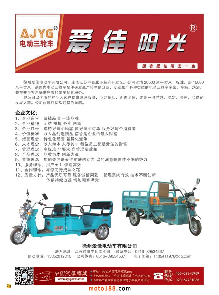 今年我們還針對(duì)一批以電動(dòng)車配件和三輪車制造為主的地區(qū)和市場增加了雜志的發(fā)行和投放。比如無錫南方國際機(jī)電城是以電動(dòng)車配件為主的市場,我們新設(shè)了發(fā)行點(diǎn);比如豐縣是全國最大的三輪車生產(chǎn)基地,我們除進(jìn)行雜志的投放外,還積極籌資成立辦事機(jī)構(gòu);類似如天津電動(dòng)車配件城、偃師燃油三輪車配件一條街都將納入到我們的發(fā)行計(jì)劃之中。從今年第九期及本期雜志之后,我們近期計(jì)劃增加10個(gè)版的三輪車內(nèi)容。將三輪車行業(yè)信息及時(shí)告知讀者,供大家在經(jīng)營之中參考。這類行業(yè)相對(duì)于摩托車行業(yè)屬于新興的,與摩托車行業(yè)有很近的血緣關(guān)系,也可以說是摩托車行業(yè)派伸出來的,如果去摩托車配件市場,大家往往可以看到在市場的一角總有一些三輪車企業(yè),停在露天待銷售的車輛,構(gòu)成了市場里新的風(fēng)景線。東隅已失,桑榆未晚。