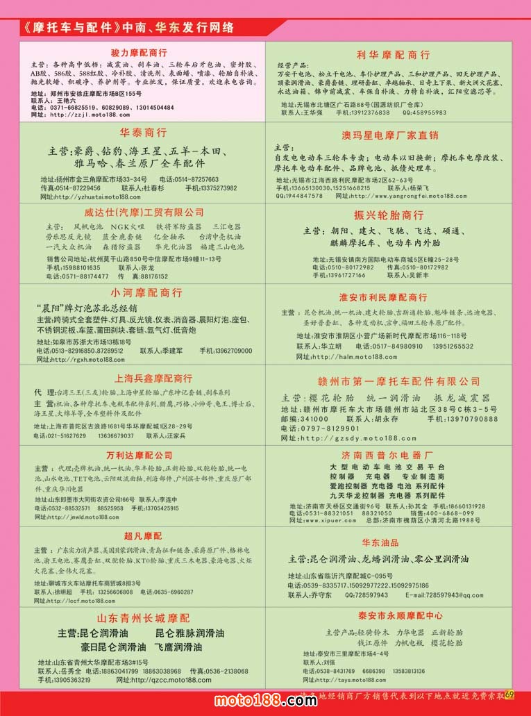 全摩會還有2個多月就在廣州召開了,這次會上我們將奉獻給大家的是第12次升級的《中國摩托車配件生產(chǎn)企業(yè)大全》在這本書中。我們新增了目錄銷售排名前10-20名的摩托車整車生產(chǎn)企業(yè),二輪電動車生產(chǎn)企業(yè)、燃油和電動三輪生產(chǎn)企業(yè)的名錄,方便大家在增加經(jīng)營的同時,有所選擇和參考?!度A南市場指南》含廣東和海南兩省市場經(jīng)銷商戶的資料,其中的廣州白云區(qū)羅沖圍一帶的市場是用中英文雙語編排,方便外商的閱讀;其余例行的十一期雜志和外貿(mào)報紙;另外還有部分華東和西北地區(qū)的新的市場指南(已經(jīng)在南京和西安會議首發(fā))。如果有興趣從事新能源汽車業(yè)務(wù)的企業(yè)也可拿到《新能源車》雜志。這是我們新出的雜志,具體可去moto189網(wǎng)站上瀏覽到全部的內(nèi)容,在此不多贅述。記住廣州再見,帶上你的名片到1075展位領(lǐng)書去!