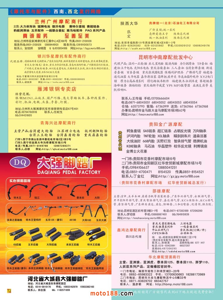 全摩會(huì)還有2個(gè)多月就在廣州召開了,這次會(huì)上我們將奉獻(xiàn)給大家的是第12次升級(jí)的《中國摩托車配件生產(chǎn)企業(yè)大全》在這本書中。我們新增了目錄銷售排名前10-20名的摩托車整車生產(chǎn)企業(yè),二輪電動(dòng)車生產(chǎn)企業(yè)、燃油和電動(dòng)三輪生產(chǎn)企業(yè)的名錄,方便大家在增加經(jīng)營的同時(shí),有所選擇和參考。《華南市場(chǎng)指南》含廣東和海南兩省市場(chǎng)經(jīng)銷商戶的資料,其中的廣州白云區(qū)羅沖圍一帶的市場(chǎng)是用中英文雙語編排,方便外商的閱讀;其余例行的十一期雜志和外貿(mào)報(bào)紙;另外還有部分華東和西北地區(qū)的新的市場(chǎng)指南(已經(jīng)在南京和西安會(huì)議首發(fā))。如果有興趣從事新能源汽車業(yè)務(wù)的企業(yè)也可拿到《新能源車》雜志。這是我們新出的雜志,具體可去moto189網(wǎng)站上瀏覽到全部的內(nèi)容,在此不多贅述。記住廣州再見,帶上你的名片到1075展位領(lǐng)書去!