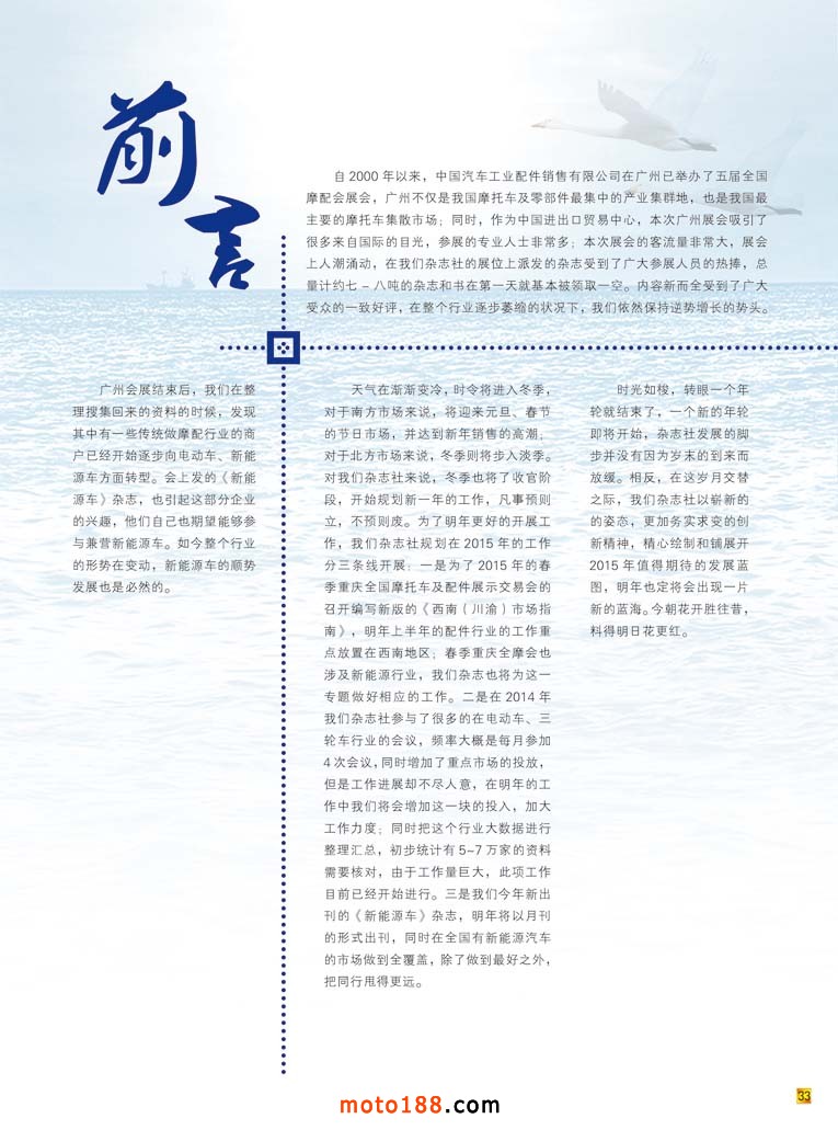 天氣在漸漸變冷,時令將進入冬季,對于南方市場來說,將迎來元旦、春節(jié)的節(jié)日市場,并達到新年銷售的高潮;對于北方市場來說,冬季則將步入淡季。對我們雜志社來說,冬季也將了收官階段,開始規(guī)劃新一年的工作,凡事預(yù)則立,不預(yù)則廢。為了明年更好的開展工作,我們雜志社規(guī)劃在2015年的工作分三條線開展:一是為了2015年的春季重慶全國摩托車及配件展示交易會的召開編寫新版的《西南(川渝)市場指南》,明年上半年的配件行業(yè)的工作重點放置在西南地區(qū);春季重慶全摩會也涉及新能源行業(yè),我們雜志也將為這一專題做好相應(yīng)的工作。二是在2014年我們雜志社參與了很多的在電動車、三輪車行業(yè)的會議,頻率大概是每月參加4次會議,同時增加了重點市場的投放,但是工作進展卻不盡人意,在明年的工作中我們將會增加這一塊的投入,加大工作力度;同時把這個行業(yè)大數(shù)據(jù)進行整理匯總,初步統(tǒng)計有5~7萬家的資料需要核對,由于工作量巨大,此項工作目前已經(jīng)開始進行。三是我們今年新出刊的《新能源車》雜志,明年將以月刊的形式出刊,同時在全國有新能源汽車的市場做到全覆蓋,除了做到最好之外,把同行甩得更遠。