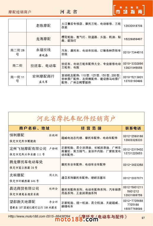 中國摩配市場從上世紀九十年代開始經(jīng)過高速度的發(fā)展,正逐步減速,摩托車行業(yè)也漸呈式微,與之緊密相關(guān)的后市場的配件與維修也呈逐步下滑之勢,取代摩托車的在發(fā)達地區(qū)是汽車,欠發(fā)達地區(qū)是電動兩輪、電動三輪,甚至電動四輪車,隨著經(jīng)濟的發(fā)展,出行的多樣化,也給了消費者多重的選擇。目前現(xiàn)有的摩托車及配件市場,也不再是以純摩托車為主體,有的市場電動車取代了摩托車,有的商店也是混合經(jīng)營,這些變化在《市場指南》里面都有所反應(yīng)。這次《北方指南》一些小市場不再單列,并入到相應(yīng)的省份中去;以前去市場的公交線路,書中也不再列入,因為現(xiàn)在的地圖導航功能十分強大,既新又準。