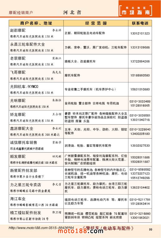 中國摩配市場從上世紀九十年代開始經(jīng)過高速度的發(fā)展,正逐步減速,摩托車行業(yè)也漸呈式微,與之緊密相關(guān)的后市場的配件與維修也呈逐步下滑之勢,取代摩托車的在發(fā)達地區(qū)是汽車,欠發(fā)達地區(qū)是電動兩輪、電動三輪,甚至電動四輪車,隨著經(jīng)濟的發(fā)展,出行的多樣化,也給了消費者多重的選擇。目前現(xiàn)有的摩托車及配件市場,也不再是以純摩托車為主體,有的市場電動車取代了摩托車,有的商店也是混合經(jīng)營,這些變化在《市場指南》里面都有所反應(yīng)。這次《北方指南》一些小市場不再單列,并入到相應(yīng)的省份中去;以前去市場的公交線路,書中也不再列入,因為現(xiàn)在的地圖導(dǎo)航功能十分強大,既新又準。