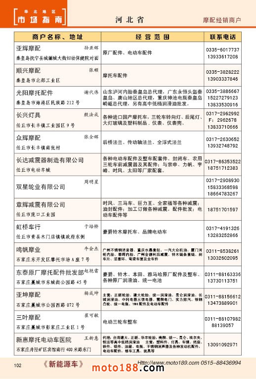 中國摩配市場從上世紀九十年代開始經(jīng)過高速度的發(fā)展,正逐步減速,摩托車行業(yè)也漸呈式微,與之緊密相關的后市場的配件與維修也呈逐步下滑之勢,取代摩托車的在發(fā)達地區(qū)是汽車,欠發(fā)達地區(qū)是電動兩輪、電動三輪,甚至電動四輪車,隨著經(jīng)濟的發(fā)展,出行的多樣化,也給了消費者多重的選擇。目前現(xiàn)有的摩托車及配件市場,也不再是以純摩托車為主體,有的市場電動車取代了摩托車,有的商店也是混合經(jīng)營,這些變化在《市場指南》里面都有所反應。這次《北方指南》一些小市場不再單列,并入到相應的省份中去;以前去市場的公交線路,書中也不再列入,因為現(xiàn)在的地圖導航功能十分強大,既新又準。