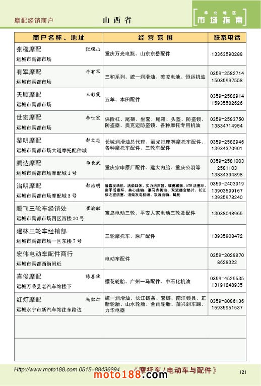 中國摩配市場從上世紀(jì)九十年代開始經(jīng)過高速度的發(fā)展,正逐步減速,摩托車行業(yè)也漸呈式微,與之緊密相關(guān)的后市場的配件與維修也呈逐步下滑之勢,取代摩托車的在發(fā)達(dá)地區(qū)是汽車,欠發(fā)達(dá)地區(qū)是電動兩輪、電動三輪,甚至電動四輪車,隨著經(jīng)濟(jì)的發(fā)展,出行的多樣化,也給了消費者多重的選擇。目前現(xiàn)有的摩托車及配件市場,也不再是以純摩托車為主體,有的市場電動車取代了摩托車,有的商店也是混合經(jīng)營,這些變化在《市場指南》里面都有所反應(yīng)。這次《北方指南》一些小市場不再單列,并入到相應(yīng)的省份中去;以前去市場的公交線路,書中也不再列入,因為現(xiàn)在的地圖導(dǎo)航功能十分強大,既新又準(zhǔn)。