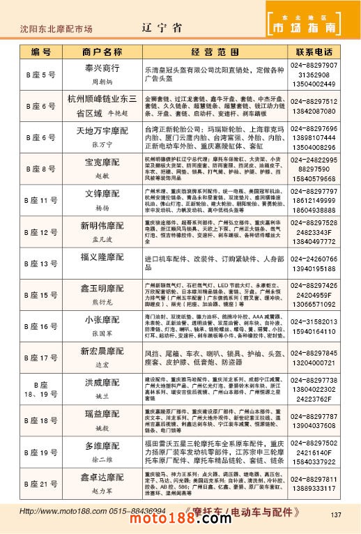 中國摩配市場從上世紀九十年代開始經(jīng)過高速度的發(fā)展,正逐步減速,摩托車行業(yè)也漸呈式微,與之緊密相關(guān)的后市場的配件與維修也呈逐步下滑之勢,取代摩托車的在發(fā)達地區(qū)是汽車,欠發(fā)達地區(qū)是電動兩輪、電動三輪,甚至電動四輪車,隨著經(jīng)濟的發(fā)展,出行的多樣化,也給了消費者多重的選擇。目前現(xiàn)有的摩托車及配件市場,也不再是以純摩托車為主體,有的市場電動車取代了摩托車,有的商店也是混合經(jīng)營,這些變化在《市場指南》里面都有所反應(yīng)。這次《北方指南》一些小市場不再單列,并入到相應(yīng)的省份中去;以前去市場的公交線路,書中也不再列入,因為現(xiàn)在的地圖導(dǎo)航功能十分強大,既新又準。