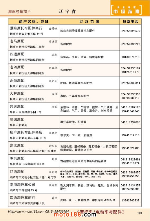 中國摩配市場從上世紀(jì)九十年代開始經(jīng)過高速度的發(fā)展,正逐步減速,摩托車行業(yè)也漸呈式微,與之緊密相關(guān)的后市場的配件與維修也呈逐步下滑之勢,取代摩托車的在發(fā)達(dá)地區(qū)是汽車,欠發(fā)達(dá)地區(qū)是電動兩輪、電動三輪,甚至電動四輪車,隨著經(jīng)濟(jì)的發(fā)展,出行的多樣化,也給了消費(fèi)者多重的選擇。目前現(xiàn)有的摩托車及配件市場,也不再是以純摩托車為主體,有的市場電動車取代了摩托車,有的商店也是混合經(jīng)營,這些變化在《市場指南》里面都有所反應(yīng)。這次《北方指南》一些小市場不再單列,并入到相應(yīng)的省份中去;以前去市場的公交線路,書中也不再列入,因為現(xiàn)在的地圖導(dǎo)航功能十分強(qiáng)大,既新又準(zhǔn)。