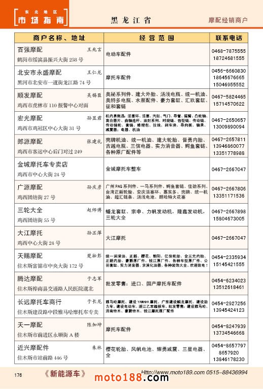 中國摩配市場從上世紀(jì)九十年代開始經(jīng)過高速度的發(fā)展,正逐步減速,摩托車行業(yè)也漸呈式微,與之緊密相關(guān)的后市場的配件與維修也呈逐步下滑之勢,取代摩托車的在發(fā)達(dá)地區(qū)是汽車,欠發(fā)達(dá)地區(qū)是電動(dòng)兩輪、電動(dòng)三輪,甚至電動(dòng)四輪車,隨著經(jīng)濟(jì)的發(fā)展,出行的多樣化,也給了消費(fèi)者多重的選擇。目前現(xiàn)有的摩托車及配件市場,也不再是以純摩托車為主體,有的市場電動(dòng)車取代了摩托車,有的商店也是混合經(jīng)營,這些變化在《市場指南》里面都有所反應(yīng)。這次《北方指南》一些小市場不再單列,并入到相應(yīng)的省份中去;以前去市場的公交線路,書中也不再列入,因?yàn)楝F(xiàn)在的地圖導(dǎo)航功能十分強(qiáng)大,既新又準(zhǔn)。