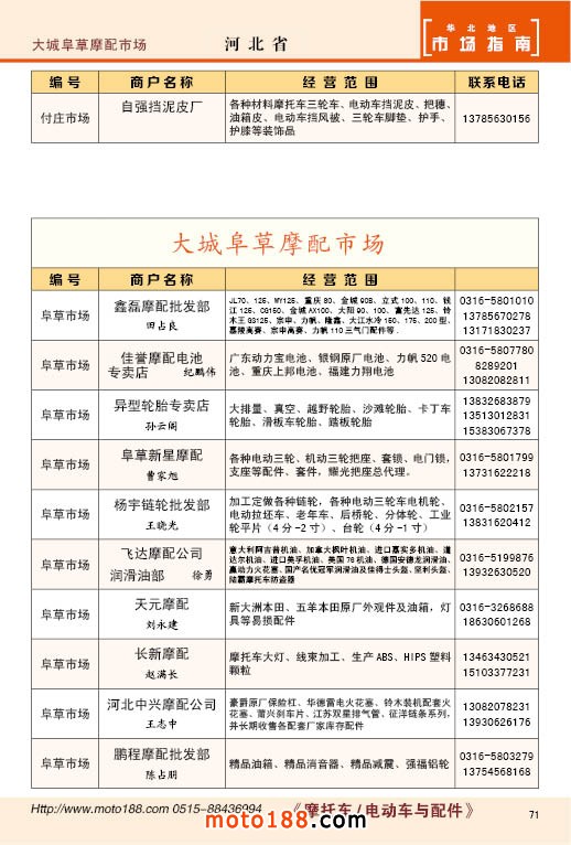 中國摩配市場從上世紀(jì)九十年代開始經(jīng)過高速度的發(fā)展,正逐步減速,摩托車行業(yè)也漸呈式微,與之緊密相關(guān)的后市場的配件與維修也呈逐步下滑之勢,取代摩托車的在發(fā)達(dá)地區(qū)是汽車,欠發(fā)達(dá)地區(qū)是電動兩輪、電動三輪,甚至電動四輪車,隨著經(jīng)濟(jì)的發(fā)展,出行的多樣化,也給了消費(fèi)者多重的選擇。目前現(xiàn)有的摩托車及配件市場,也不再是以純摩托車為主體,有的市場電動車取代了摩托車,有的商店也是混合經(jīng)營,這些變化在《市場指南》里面都有所反應(yīng)。這次《北方指南》一些小市場不再單列,并入到相應(yīng)的省份中去;以前去市場的公交線路,書中也不再列入,因為現(xiàn)在的地圖導(dǎo)航功能十分強(qiáng)大,既新又準(zhǔn)。